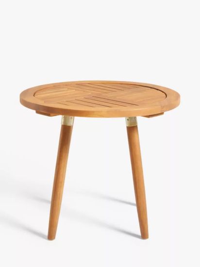 - Our range of outdoor wooden furniture is all made from sustainably sourced, naturally weather-resistant tropical hardwood. Round garden side table with geometric design and elegant tapered legs, foot covers protect floors and furniture legs, and adjustable height to accommodate uneven surfaces.