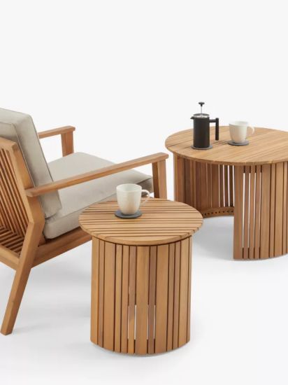 - Key Features: Two round garden coffee tables that nest together for compact storage, modern slatted design, naturally weather-resistant FSC certified acacia wood, foot covers to protect floors and furniture legs, and adjustable height to accommodate uneven surfaces.
