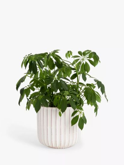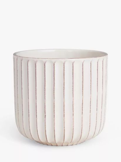 - Ceramic ribbed planter, hand-decorated with distressed finish. Handcrafting gives each item subtle variations, making each one unique. This planter is suitable for all indoor plants and does not have drainage holes.